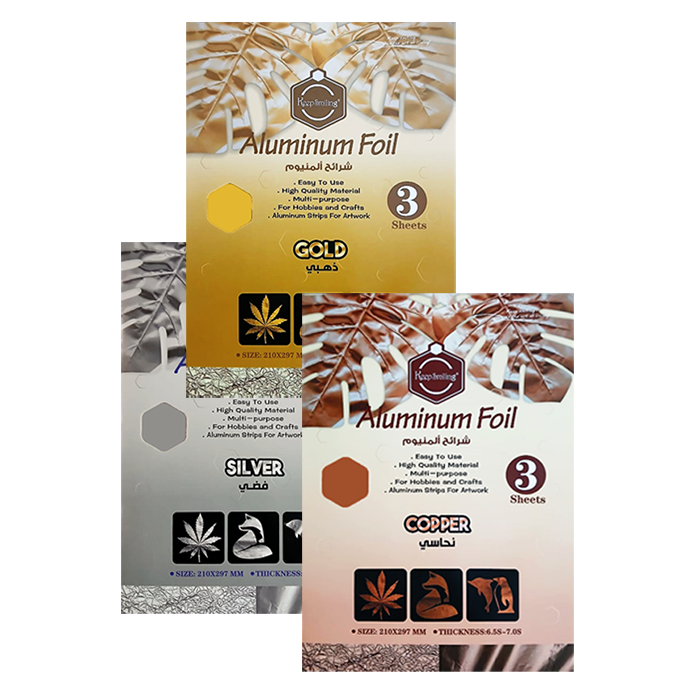 The Keep Smiling Aluminum Foil Set includes 3 premium A4 sheets in Gold, Silver, and Copper colors, perfect for art, craft, decoration, and school projects. Each foil sheet is made from high-quality metallic paper that’s easy to cut, fold, or glue — ideal for card making, wrapping, and DIY crafts.