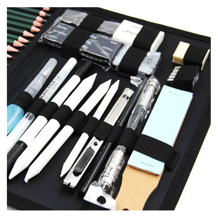 Complete Artist Tools – Blending stumps, knife, erasers, and brush pen for professional finishing touches.