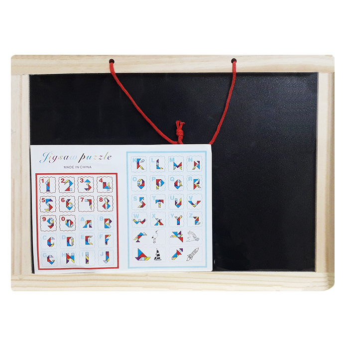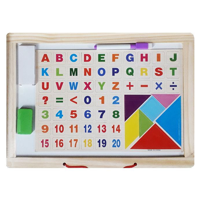 Consists of 1 magnetic double sided black and white board, 3 chalks, 1 marker, 1 duster / eraser, , magnetic alphabets, numbers and mathematical signs
